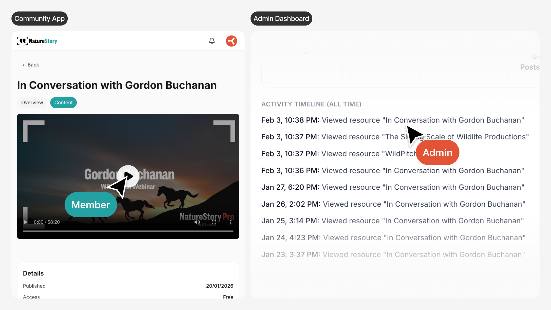 Every action a member takes in your Community App automatically appears in their activity timeline on your Admin Dashboard. No manual tracking needed.